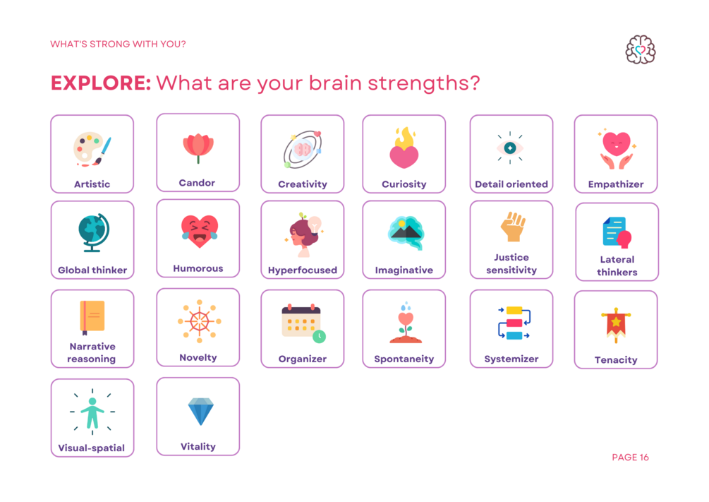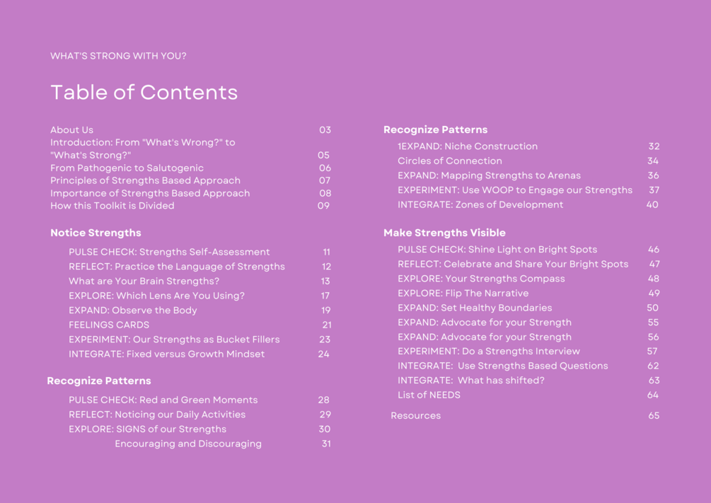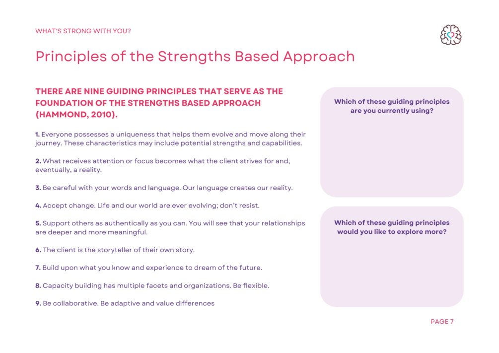 20+ tools, reflection and activity worksheets, and resource cards that you can use to: Notice how you use your strengths, recognize patterns in leading and engaging with your strengths and how to make your strengths visible in your day-to-day life